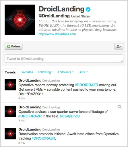 Create a unique spy-driven story that puts Droid fans right in the middle of the action. Their mission: help a top secret operative recover a stolen Droid RAZR from enemy hands.